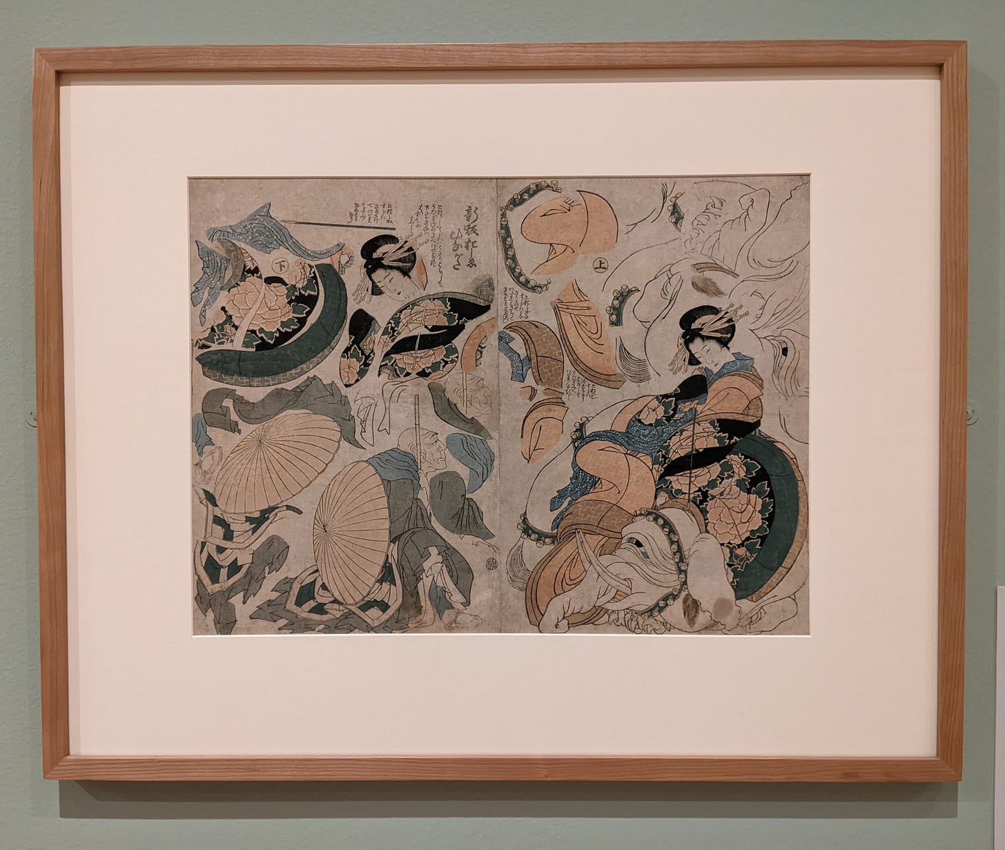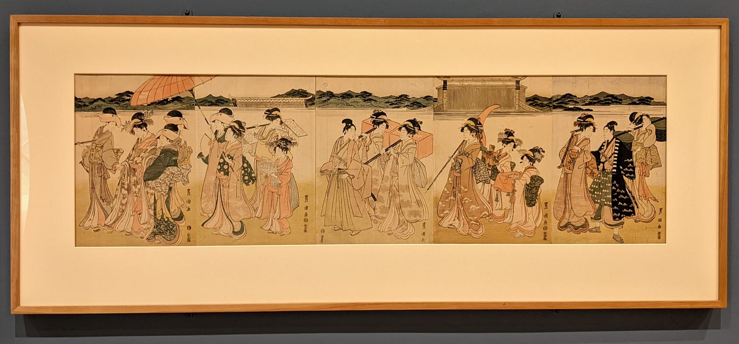 "Each of the five panels in this print (A Procession of Women Going to a Shrine, above) varies slightly in color and condition, indicating that they probably came from different impressions of the same design and were united later. They thus allow a sense of how different impressions of a print can vary, as well as how printing inks and paper change over time depending on how the images have been stored or displayed."